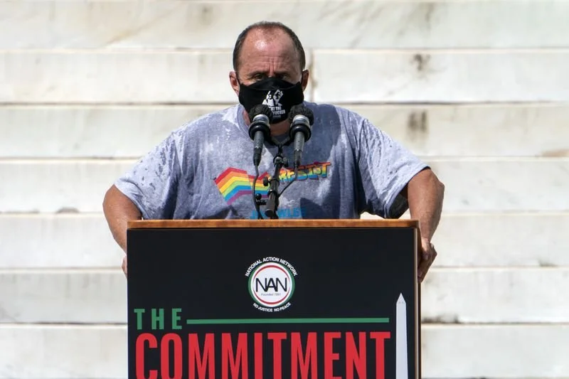Allen Roskoff, a gay rights advocate, speaks during the March on Washington, Friday, Aug. 28, 2020, at the Lincoln Memorial in Washington, D.C. (Jacquelyn Martin/AP)
