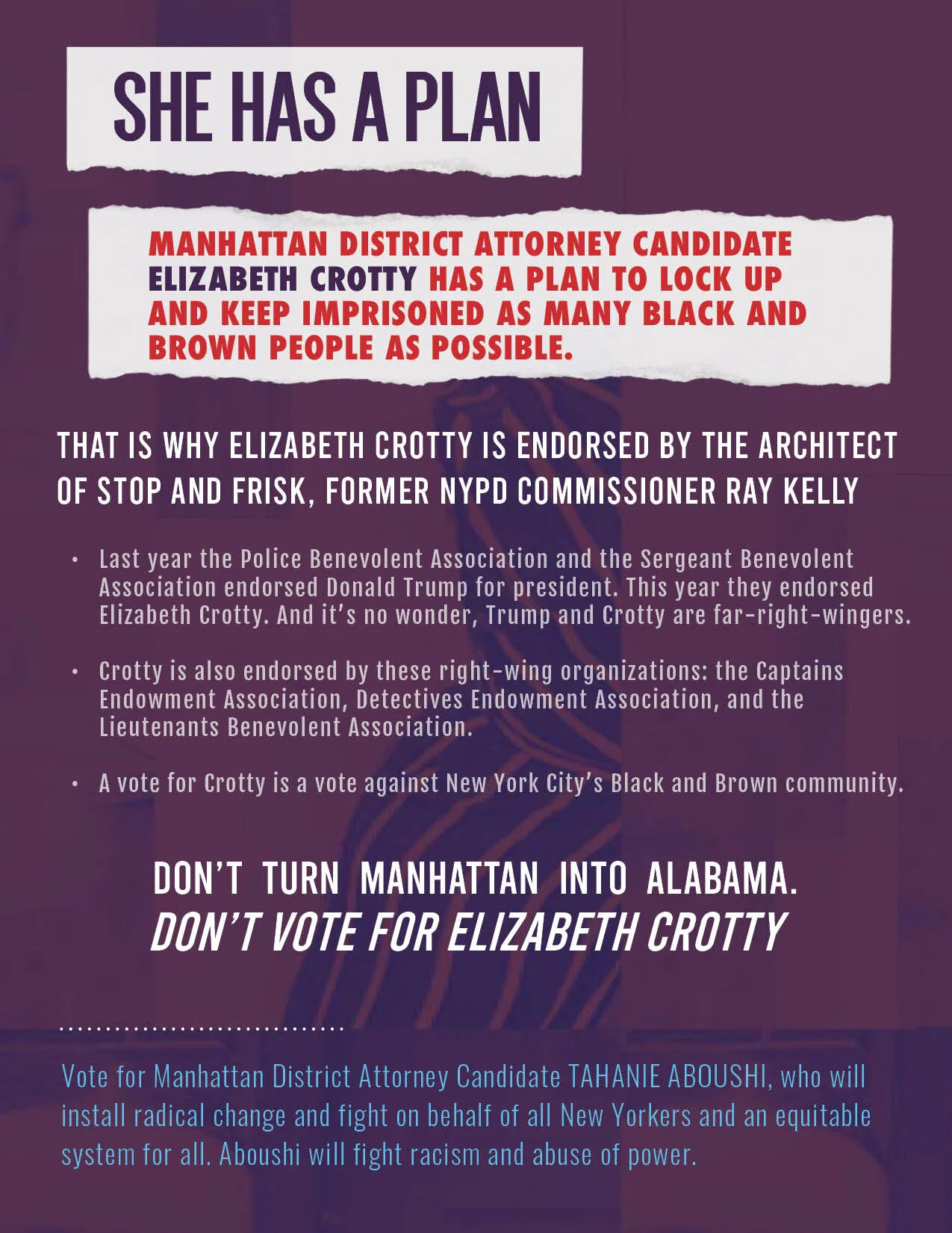 NEW YORK - The Jim Owles Liberal Democratic Club announced today that it has sent out mailers opposing Elizabeth Crotty, a candidate for Manhattan District Attorney, for supporting failed law and order policies that have disproportionately impacted Black and Brown New Yorkers.